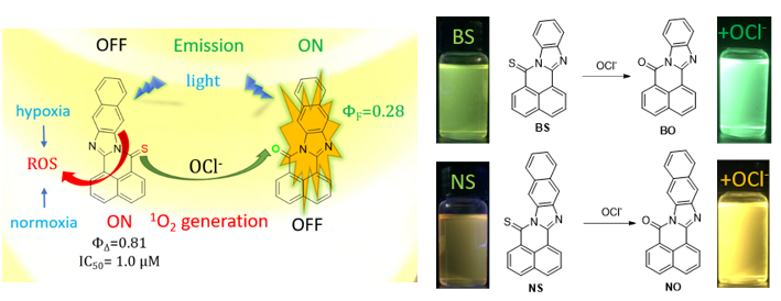 We designed and synthesized the thionated NpImidazole derivatives BS and NS, new heavy-atom-free photosensitizers, which efficiently generates a triplet excited state with high singlet oxygen quantum yield. The introduction of C=S bond to NpImidazole core is essential for increasing spin-orbit coupling (SOC). The fluorescence emission of BS and NS were quenched at standard ambient temperature, accompanying with the increase of ISC process from the singlet states to triplet excited states via thionation. BS and NS showed negligible dark cytotoxicity against HeLa cells in working concentration. In the contrast, BS and NS rapidly induced cell death under blue light irradiation both in normoxia and hypoxia condition. Our current study demonstrates that C=S group can play an important role in type I ROS generation of PSs, which have unprecedented in the previous reports. Finally, the photophysical changes was assigned to the oxidative desulfurization of C=S group of BS and NS to C=O group of the corresponding BO and NO via hypochlorite. The combined results demonstrated the dual function of BS and NS as a fluorescent imaging agent for ClO- and an anti-cancer therapeutic by PDT that showed the potential strategy for “one-for-all” as well as multifunctional agents.